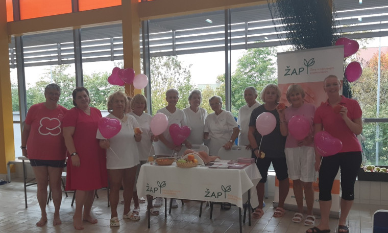 Tentokrát jsme se pokusili přeplavat „Svět“. Za náš Klub ŽAP se akce zúčastnilo „sedm statečných“ žen. Jednou z nich je paní Dana Pařízková, která tak ve svých 91 letech dokázala, že věk je opravdu jen číslo. Za svůj plavecký výkon byla odměněna čepičkou od sponzora BTS. Děvčata z našeho Klubu ŽAP edukovala spolu s Alenkami veřejnost na prsních fantomech a kladla velký důraz na nutnost samovyšetřování. Zajímavý byl i doprovodný program - pro malé plavce připravili studenti medicíny nemocnici pro medvídky, velký zájem byl o focení pod vodou s fotografkou Alicí Bachňákovou, Petra Zavadilová z BTS / BORN TO SWIM / pomáhala zdokonalit plavecký styl. Každý plavec dostal za uplavané metry sladké jablíčko od sponzora akce „Ovocné sady Bříství“.